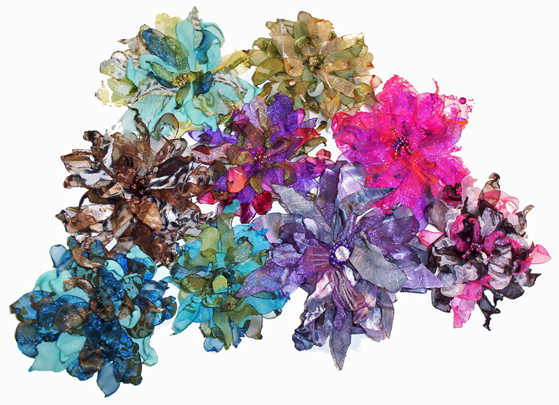 Fabulous Burnt Edge Flowers for Spring.  These colorful, lightweight free-form flowers are one of a kind.  They are all embellished with just the right beads or crystals to perfectly enhance the colors of the petals.  They are available either with a pin backing to add to your favorite shirt, jacket, handbag or that special quilt square or with a hair elastic to adorn your hair.  They retail for $23.00 each and can be purchased by contacting me directly, pamela@poozles.com, or by visiting me at one of the art shows I participate in this fall.  I also teach this as a workshop.