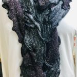 This luxuriously pieced scarf features a braid of three heathered up-cycled knits in shades of purple, gray and blue.  The fibers are acrylic and polyester so the scarf lightweight with a lot of style.
